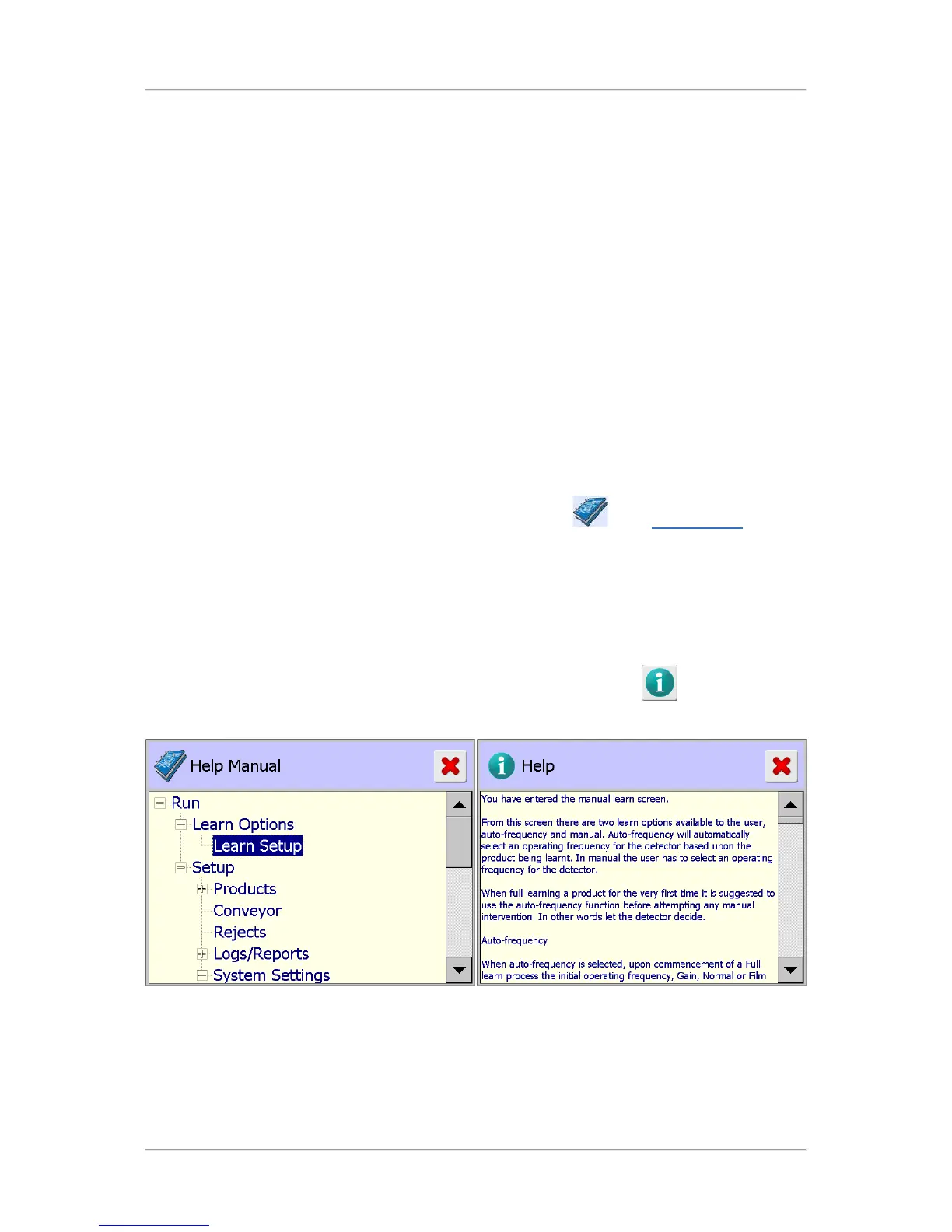 Tapping on the button in the Help Manual screen will close the screen and display the System Setup