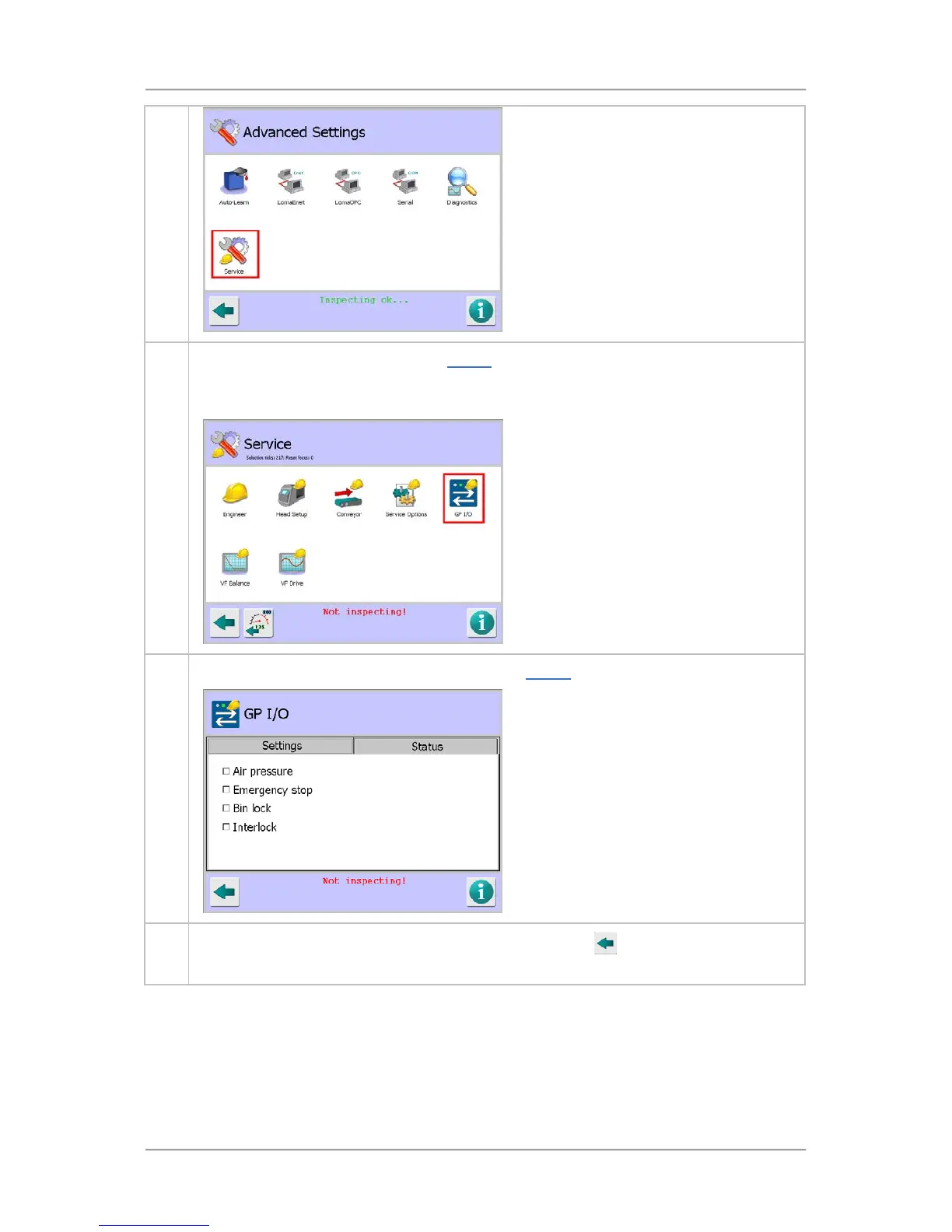 Note that the detector will stop inspecting whilst you are in any Service screen, as indicated