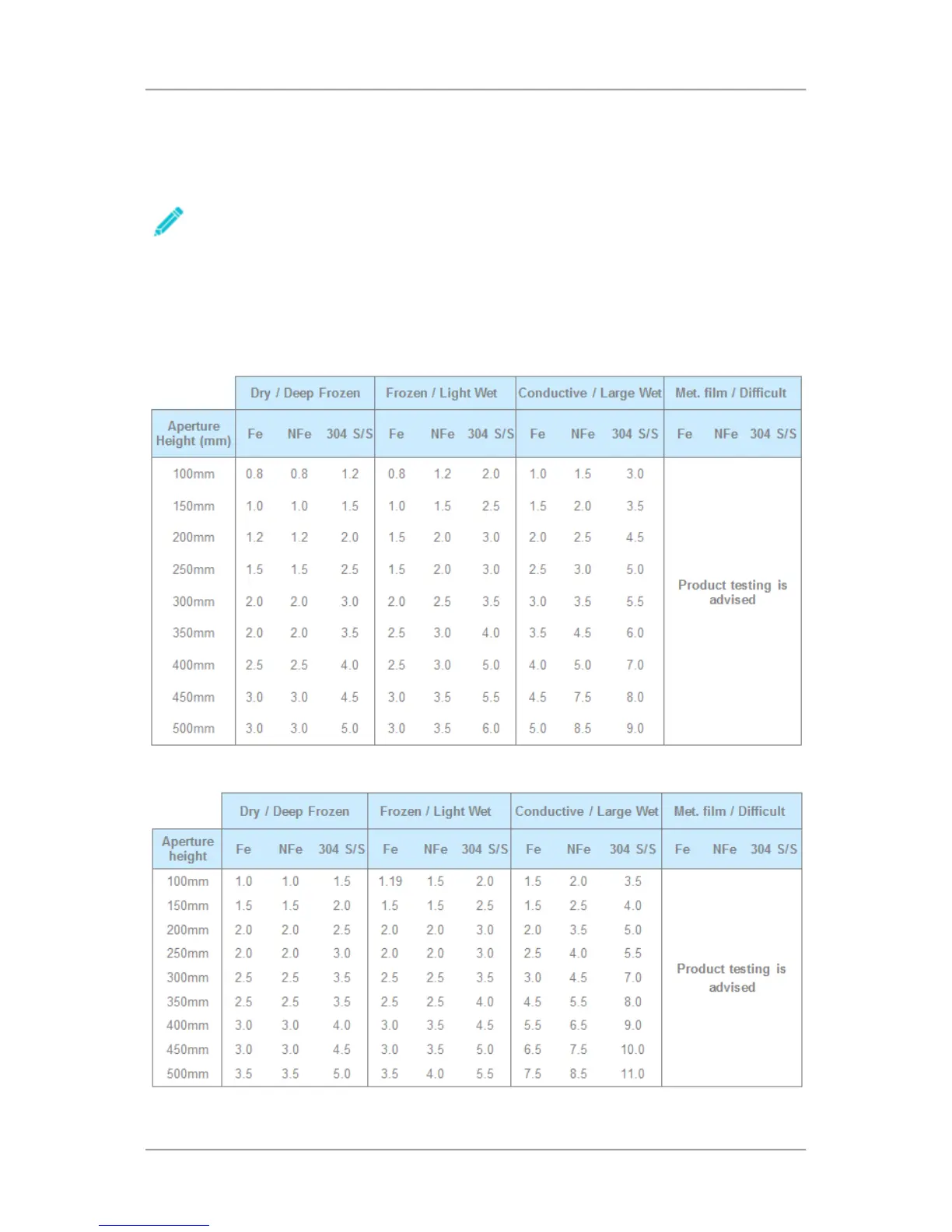 Each value shown is the diameter in millimetres (mm) of a spherical metal contaminant, as contained