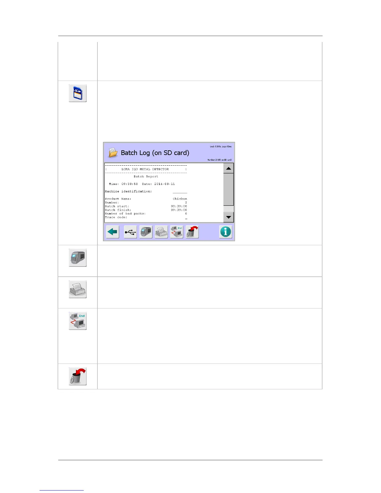 Tapping on the icon displays the Batch Log (on SD card) screen which provides a