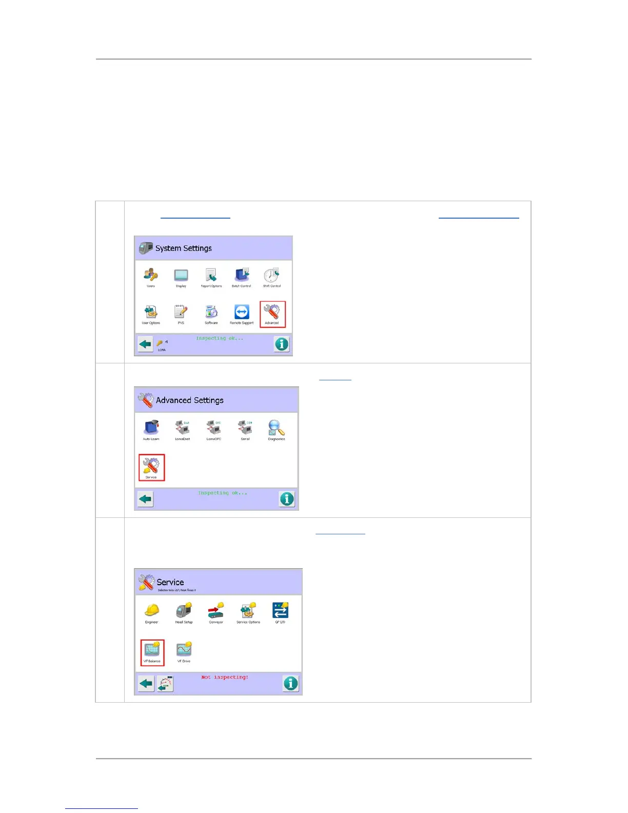 Note that the detector will stop inspecting whilst you are in any Service screen, as indicated