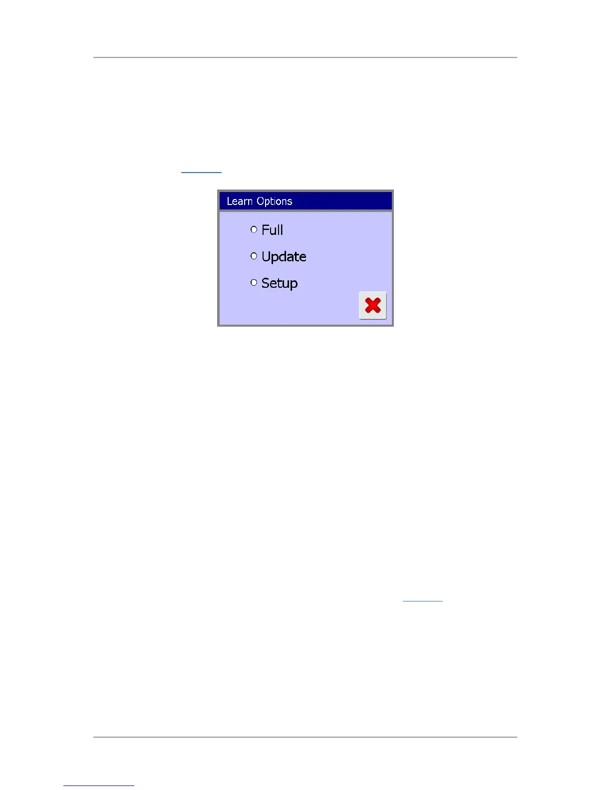 Tapping on this option starts the Update Learn process. See the Update Learn screen for