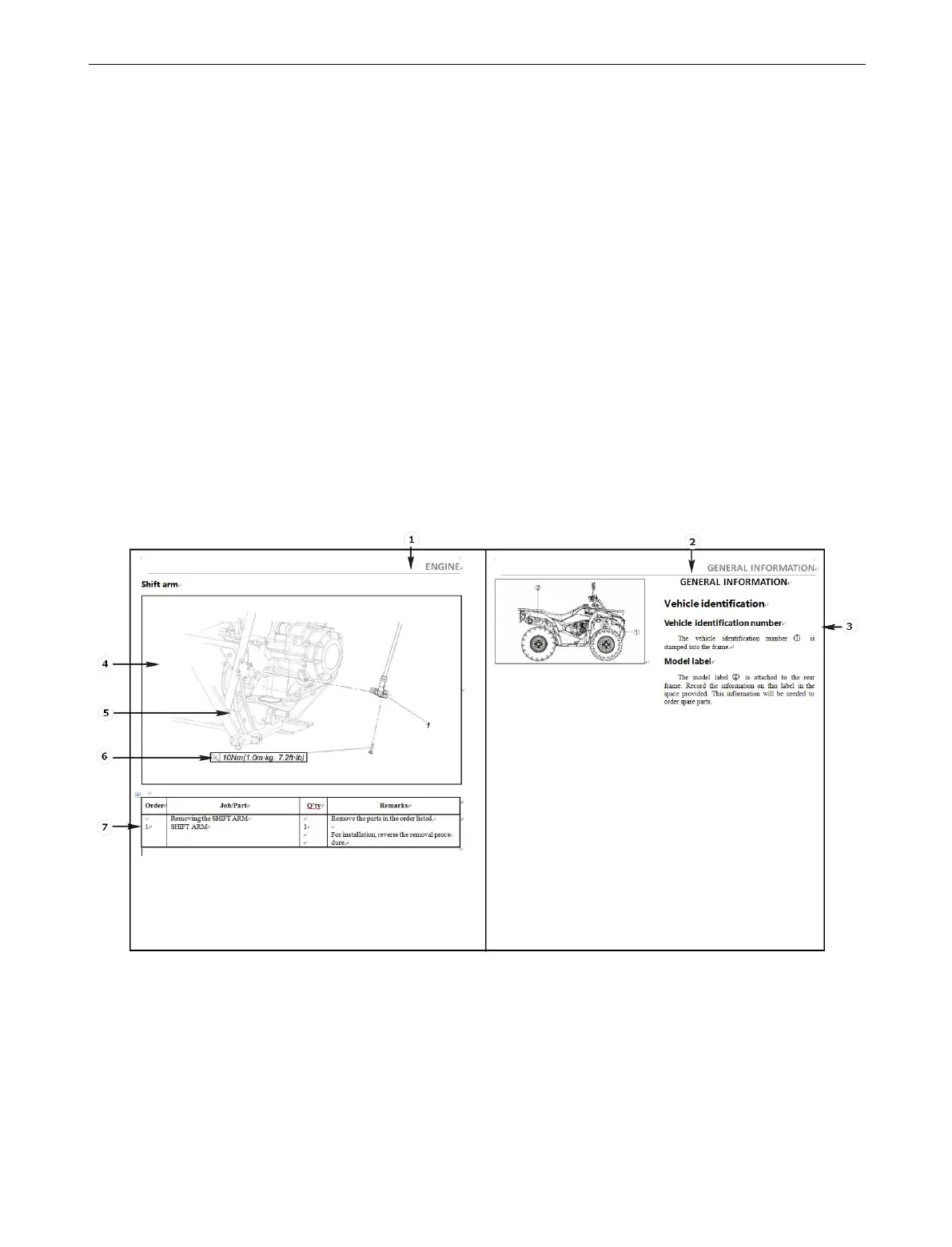 5. A job instruction chart ⑦ accompanies the exploded diagram, providing the order of jobs, names of parts,