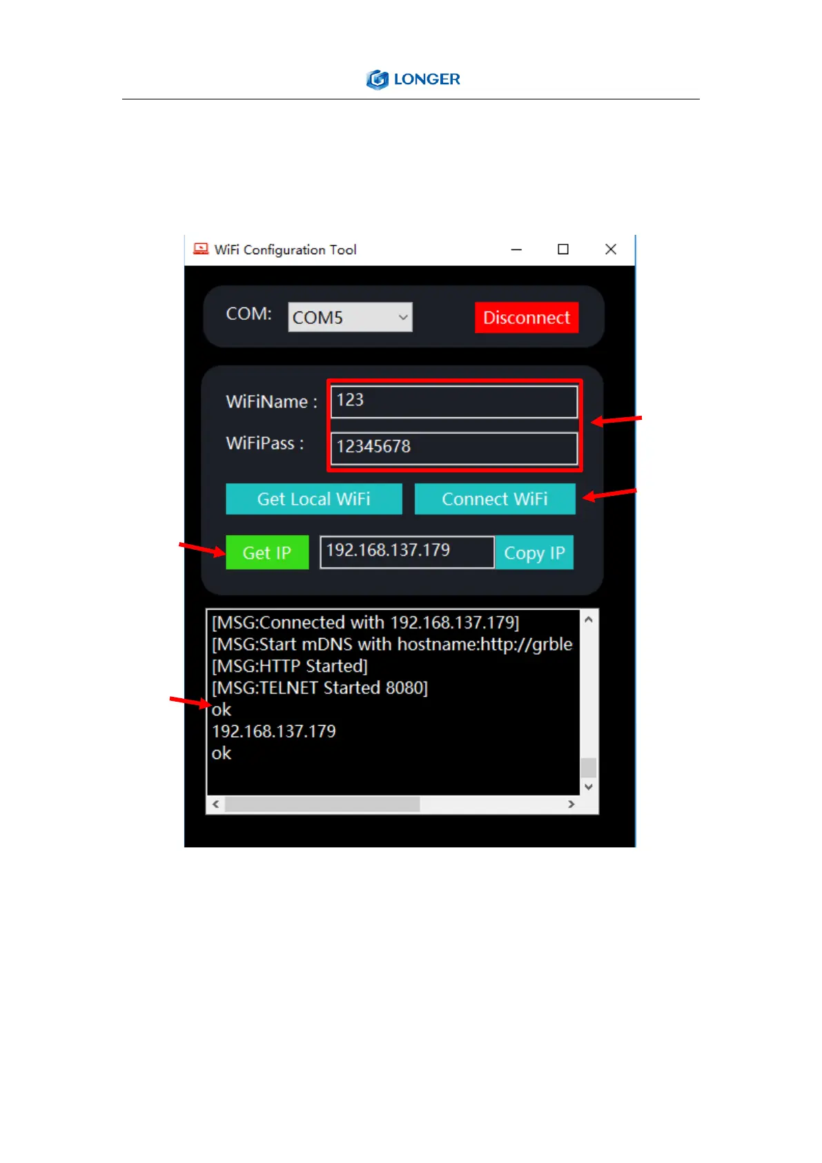 Connect WiFi. Wait for the word 'ok' to appear in the log below, and