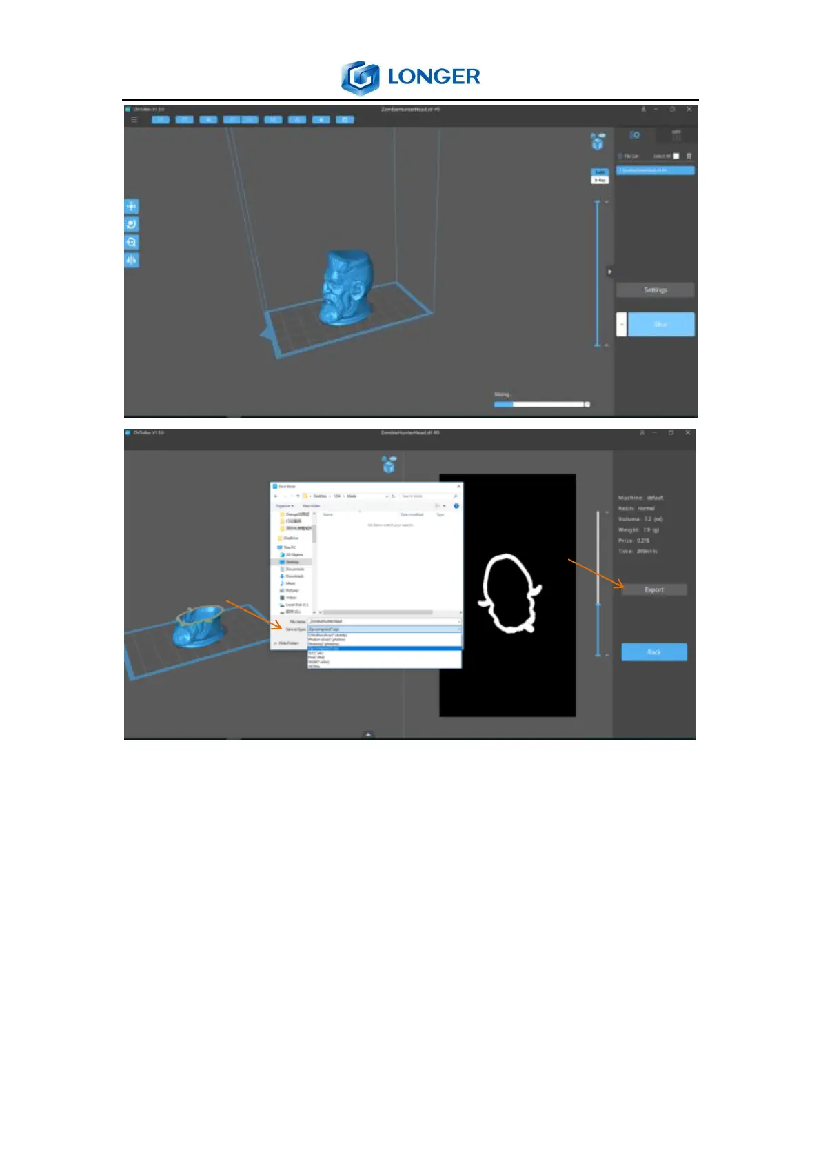 to save the file as zip format, then run LONGER slicer software