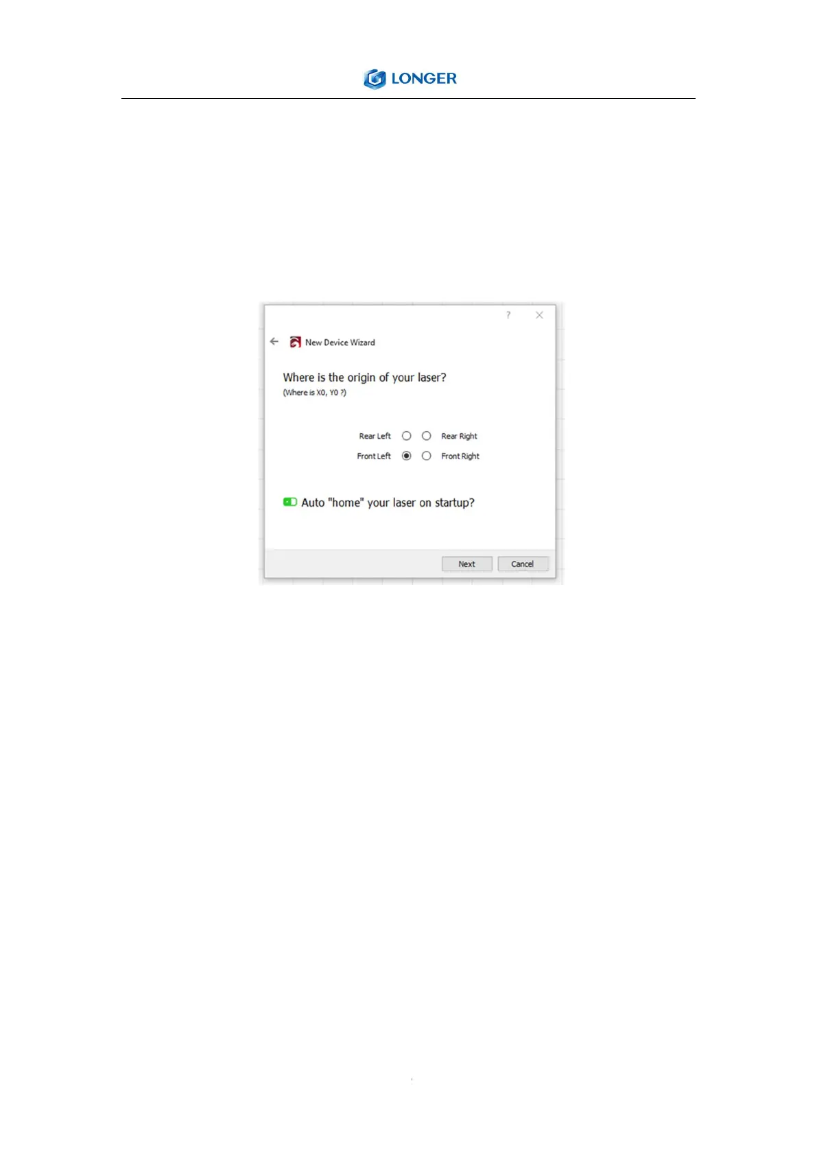 8. Select Front Left as your origin X, Y and activate Auto “Home”, then press Next.