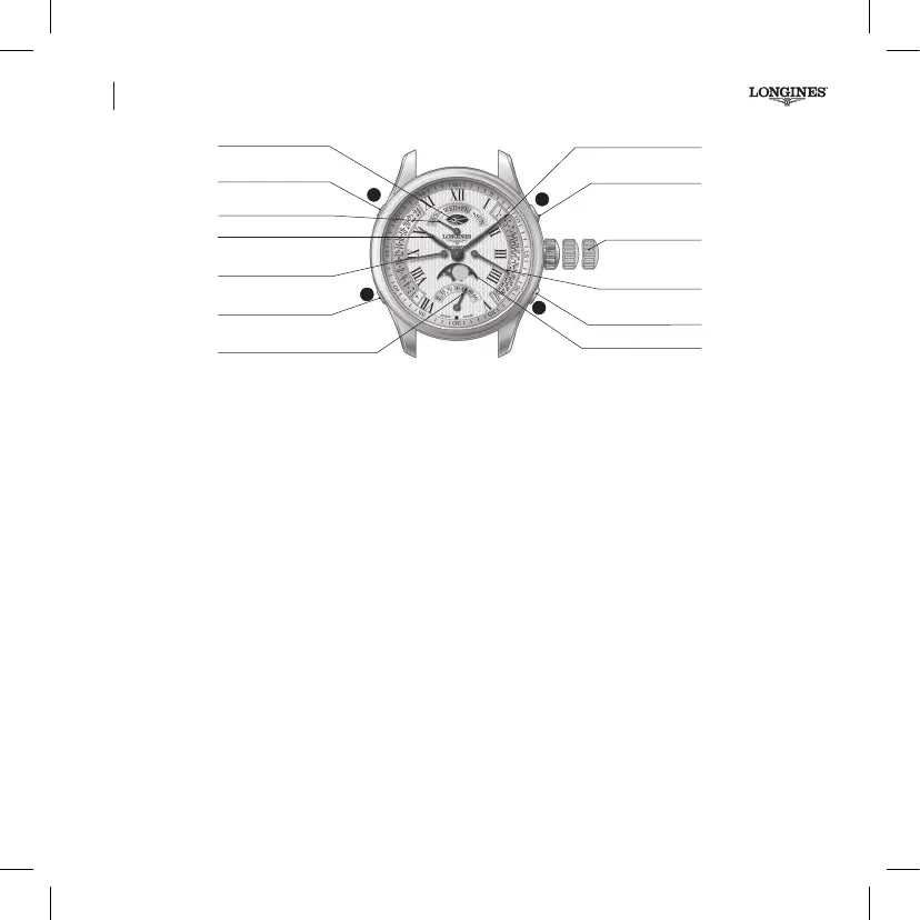 wskazówki, dzień, datę, godzinę drugiej strefy czasowej, a także fazy