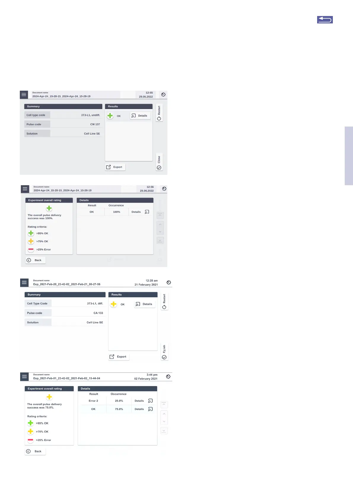 experiment. (C/D) Result screen for experiment with few errors. Tapping the