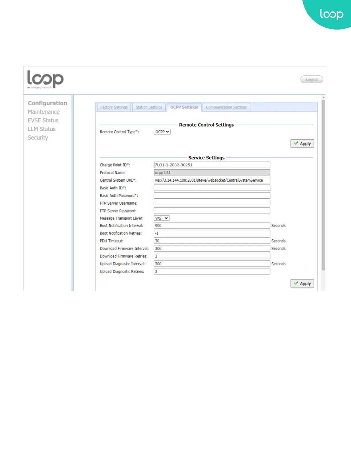 On this page you can change the properties just for the Loop EV-Flex EVSE. Click the “Apply” button