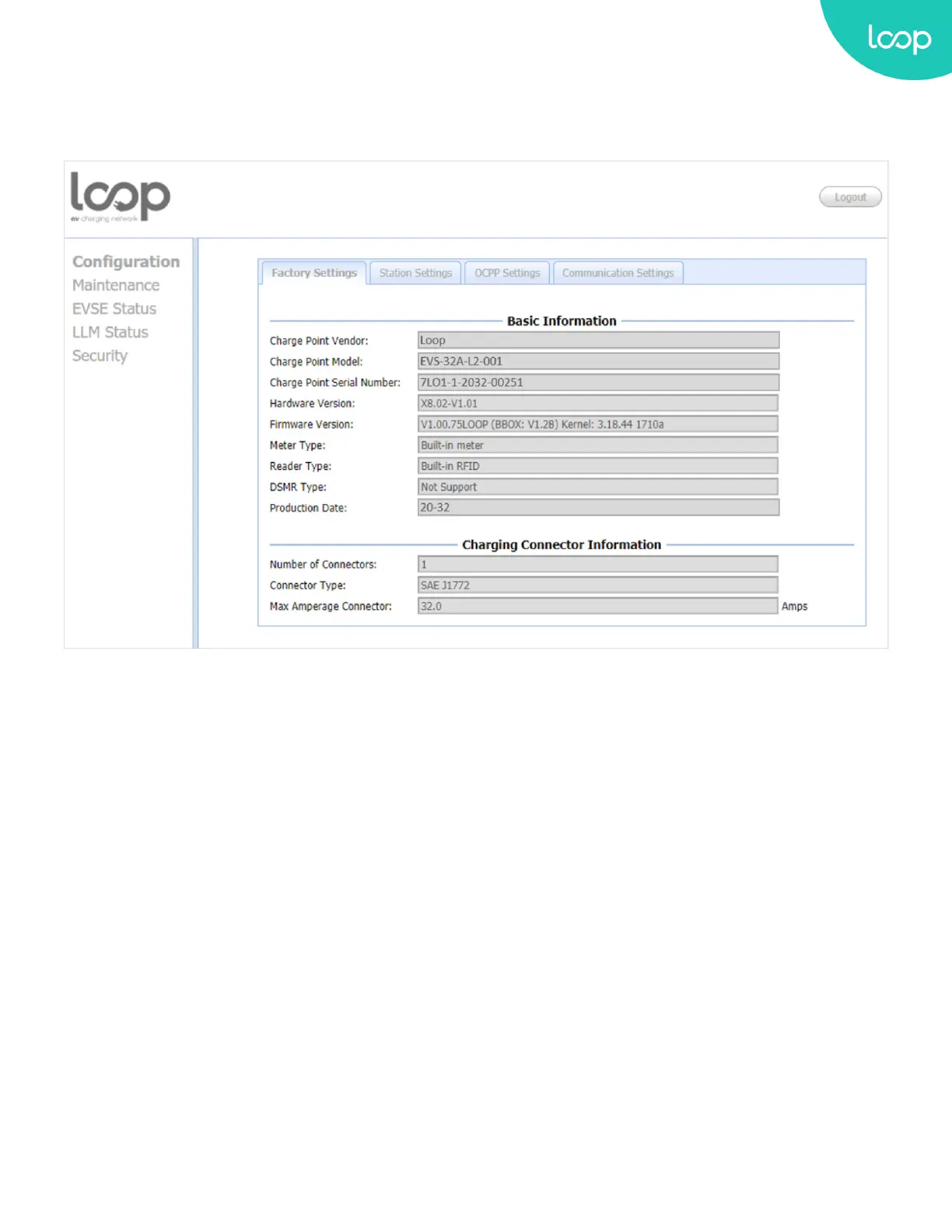 + The “Factory Settings” tab is used to display the information of the Loop EV-Flex EVSE.