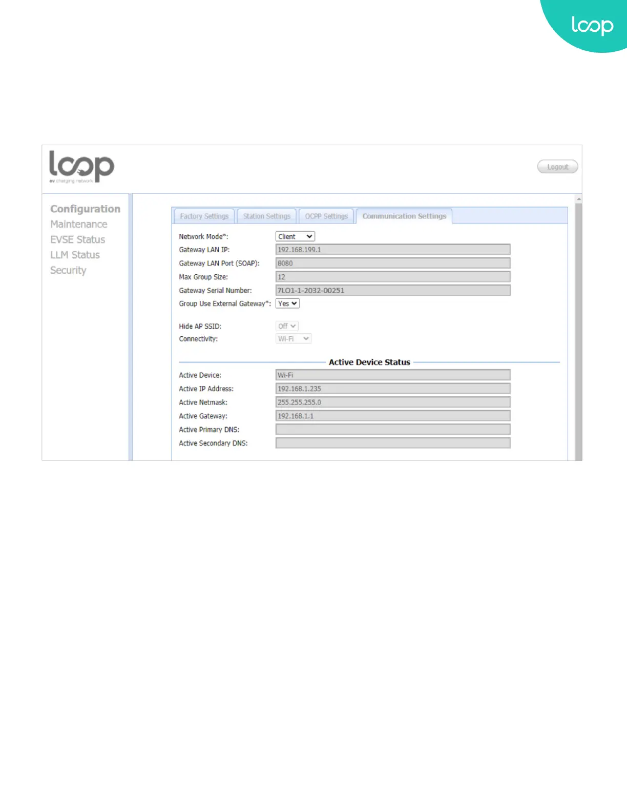 Wi-Fi and connected to other Loop EV-Flex EVSEs (called Client) via Wi-Fi and forms a local charge point group. This