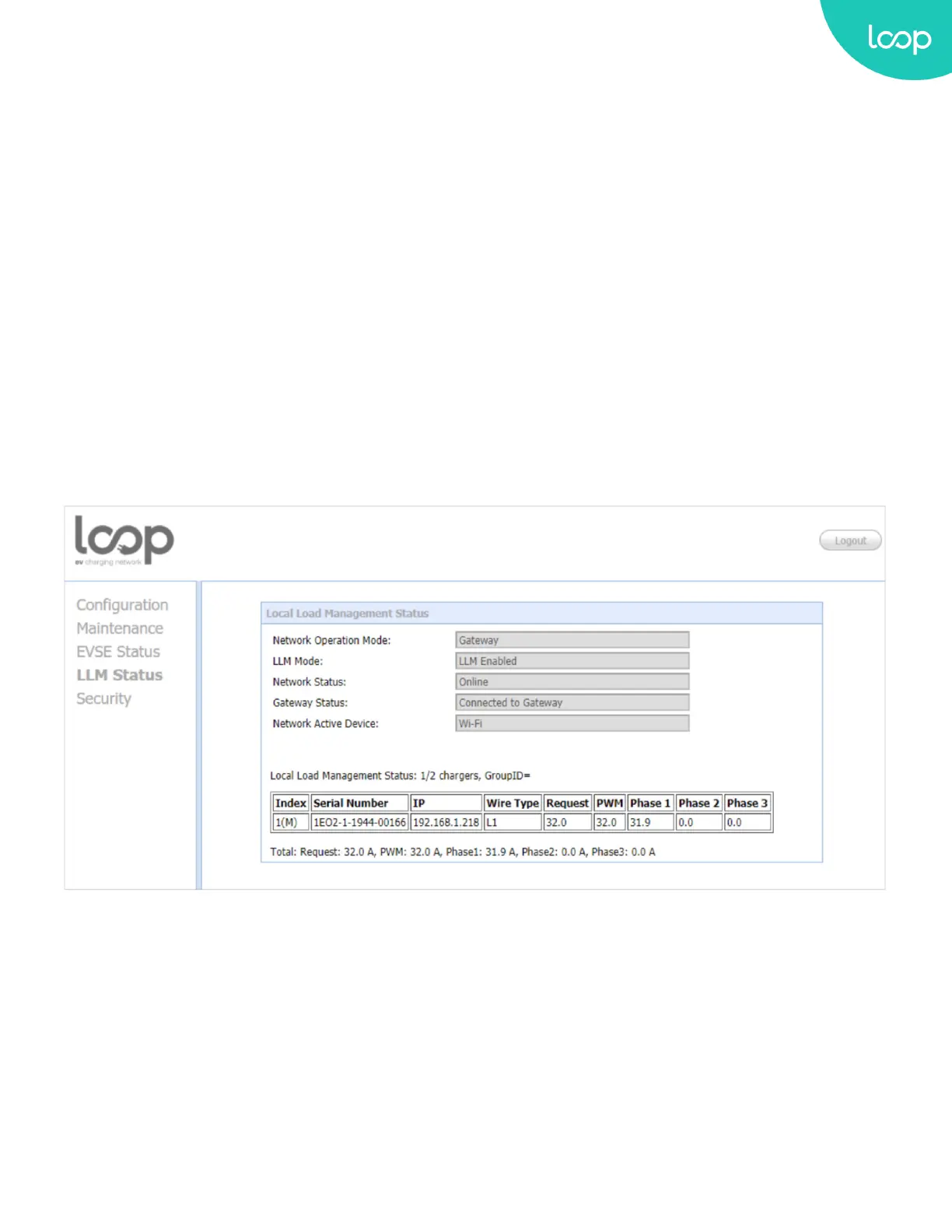 This page shows the Local Load Management information of the Loop EV-Flex EVSE. For more LLM description,