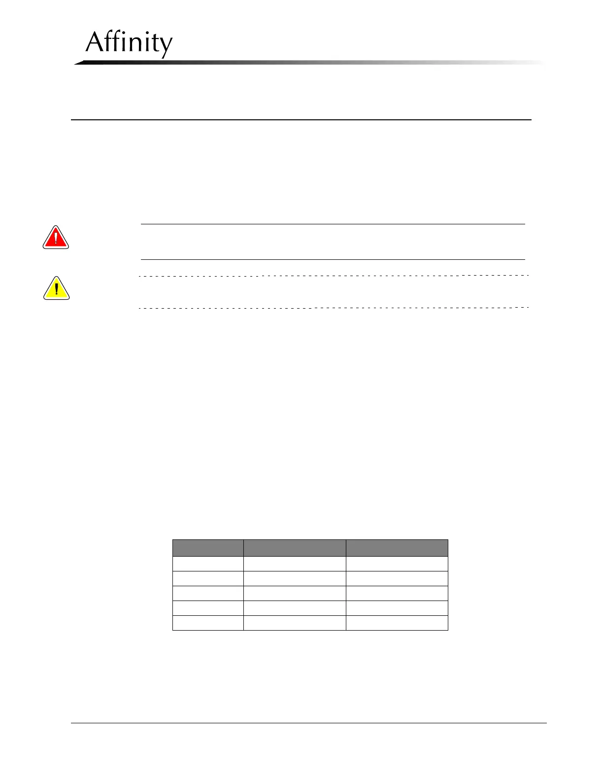 Use the following test point tables as an aid for troubleshooting the Affinity.