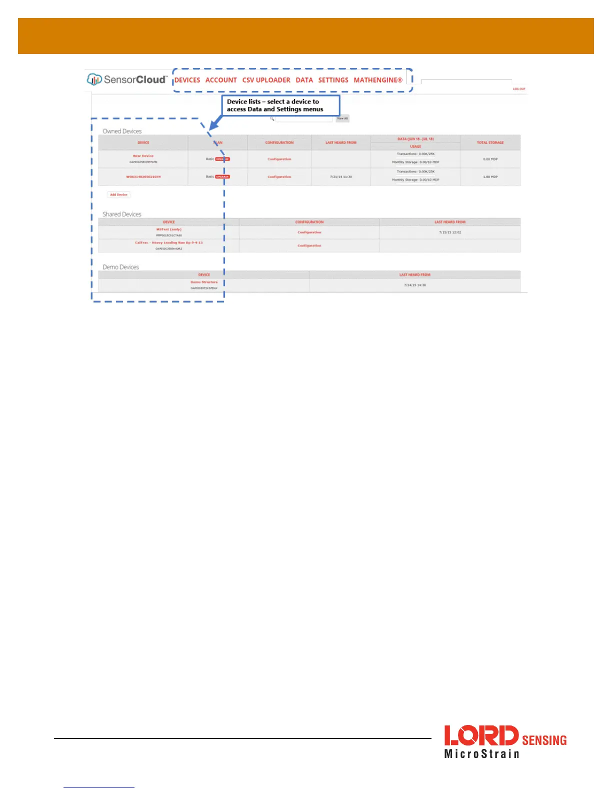 SensorCloud account, including owned, shared, and demo devices. This view provides links to each