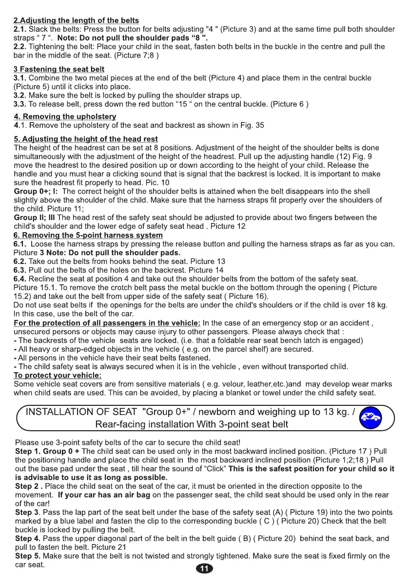 Lorelli MERCURY - Adjusting the Length of the Belts; Fastening the Seat Belt; Removing the Upholstery; Adjusting the Height of the Head Rest