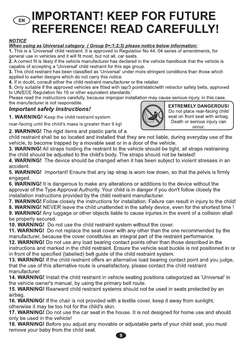 Lorelli MERCURY - Important Information; Important Safety Instructions; When Using as Universal Category