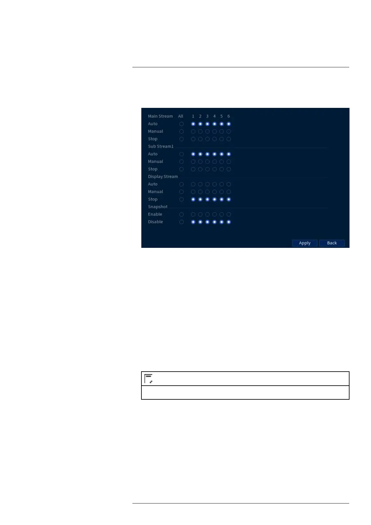 3. Under Sub Stream, select how the system will record the Sub Stream for each channel.