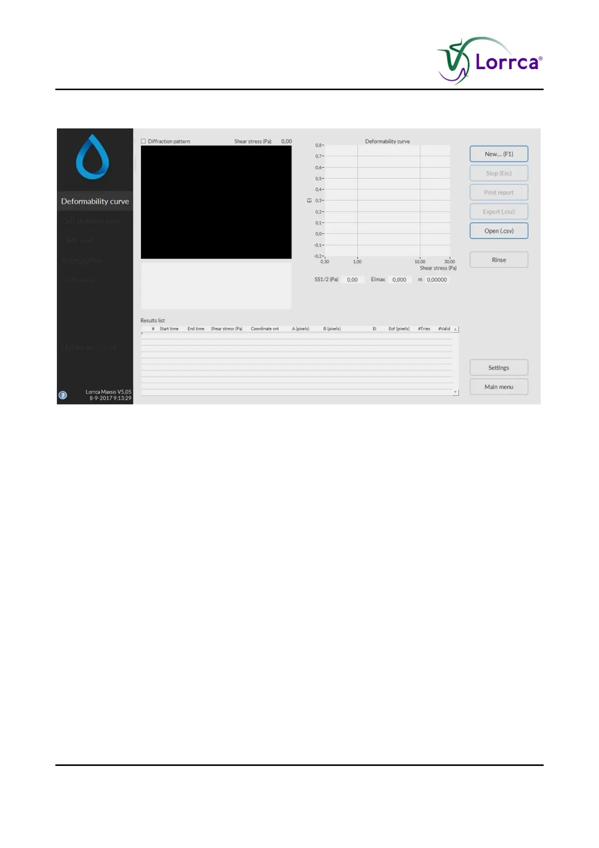 This screen appears when starting a deformability measurement. See Deformability curve (on