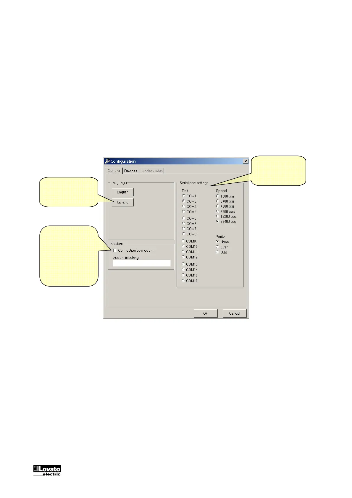 serial port setting, that must be used to select the PC serial port, and to the serial interface settings that