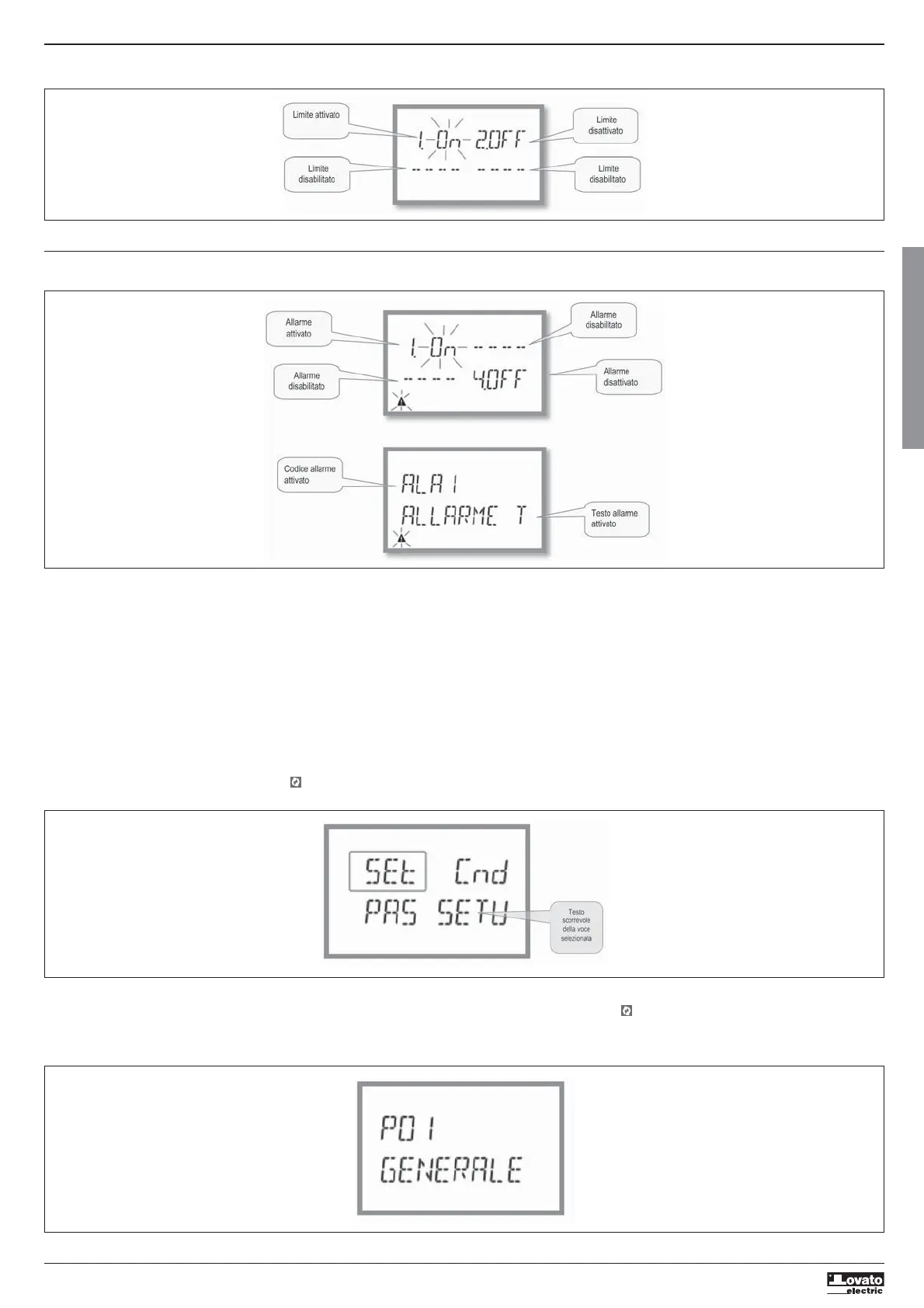 – Se i limiti sono abilitati (vedere menu P08), il DME D332 visualizza la pagina con il relativo stato e con il formato indicato in figura: