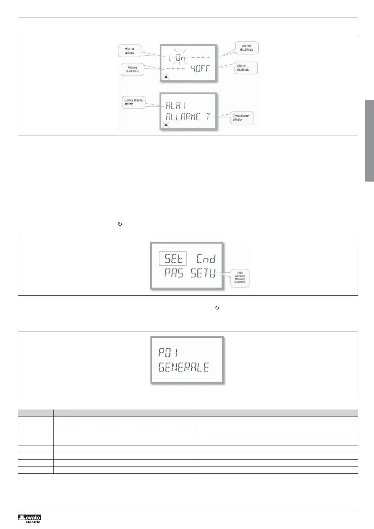 – Tramite l’apposito parametro P02.14 del menu utilità, è possibile fare in modo che la retroilluminazione del display lampeggi in caso di allarme per evidenziare la presenza dell’anomalia.