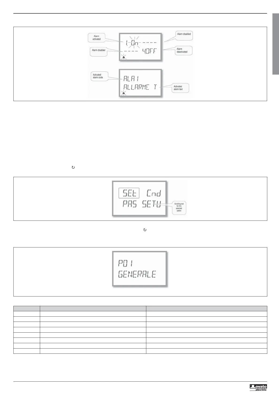 – If alarms are enabled (see menu P09), the DMG100-110 displays the page, with the corresponding status and the format indicated in the figure: