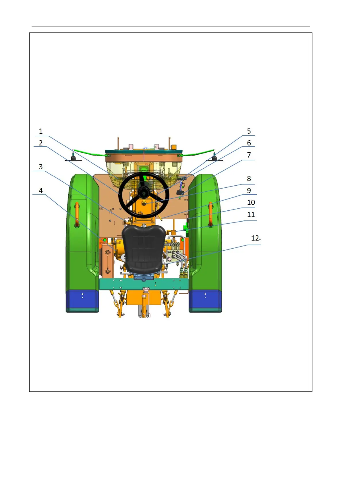1.Clutch Pedal 2. Steering wheel 3.Front drive axle joystick 4. Power takeoff gear shift lever 5.Brake