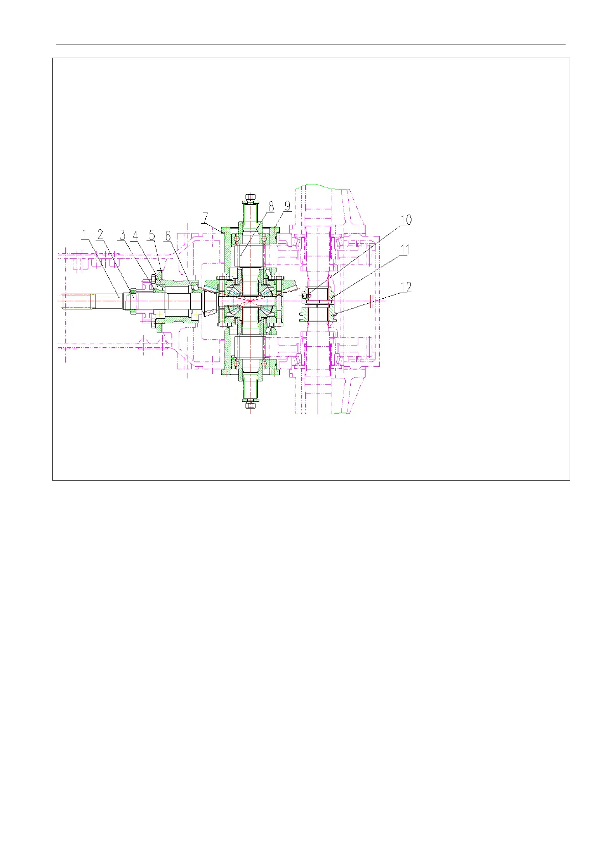 1. Driving bevel gear of main drive; 2. Lock nut; 3. Cone bearing; 4. Bearing seat of driving gear; 5. Adjusting