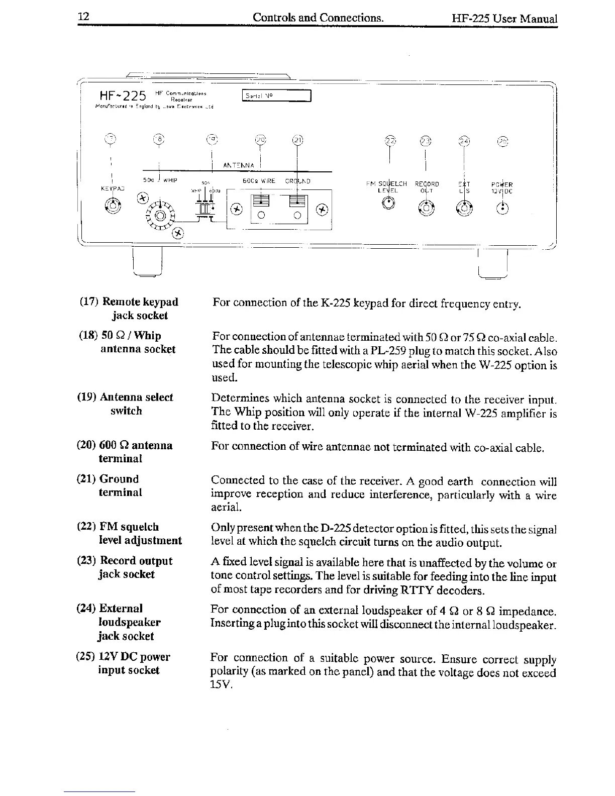 Lowe HF-225 - Remote keypad jack socket; 50 Ω; Whip antenna socket; Antenna select switch; 600 Ω antenna terminal