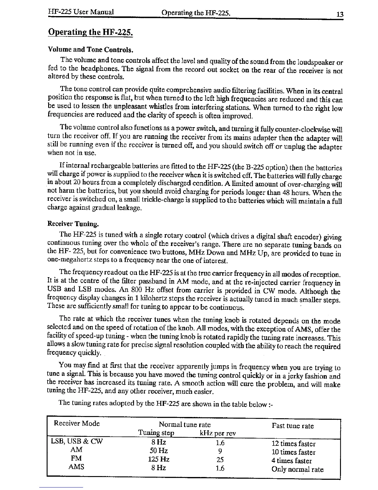 Lowe HF-225 - Operating the HF-225; Volume and Tone Controls; Receiver Tuning; Tuning Rates by Receiver Mode