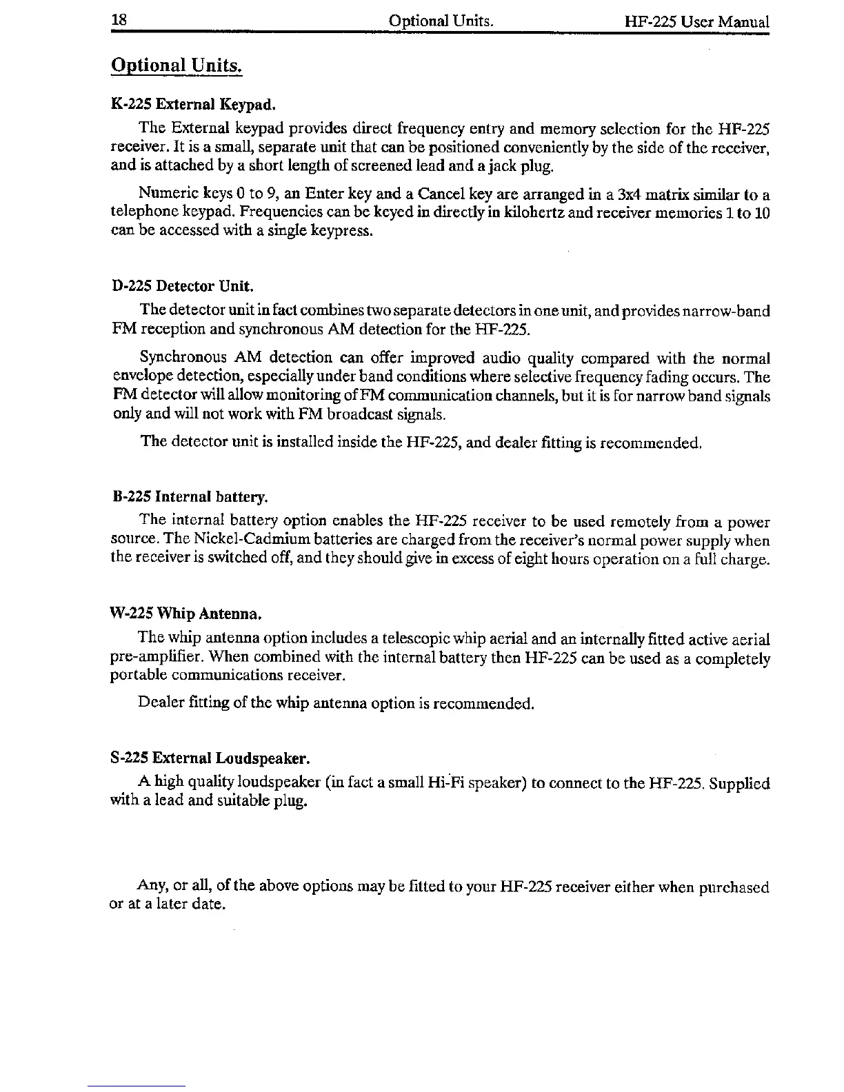 Lowe HF-225 - Optional Units; K-225 External Keypad; D-225 Detector Unit; B-225 Internal battery