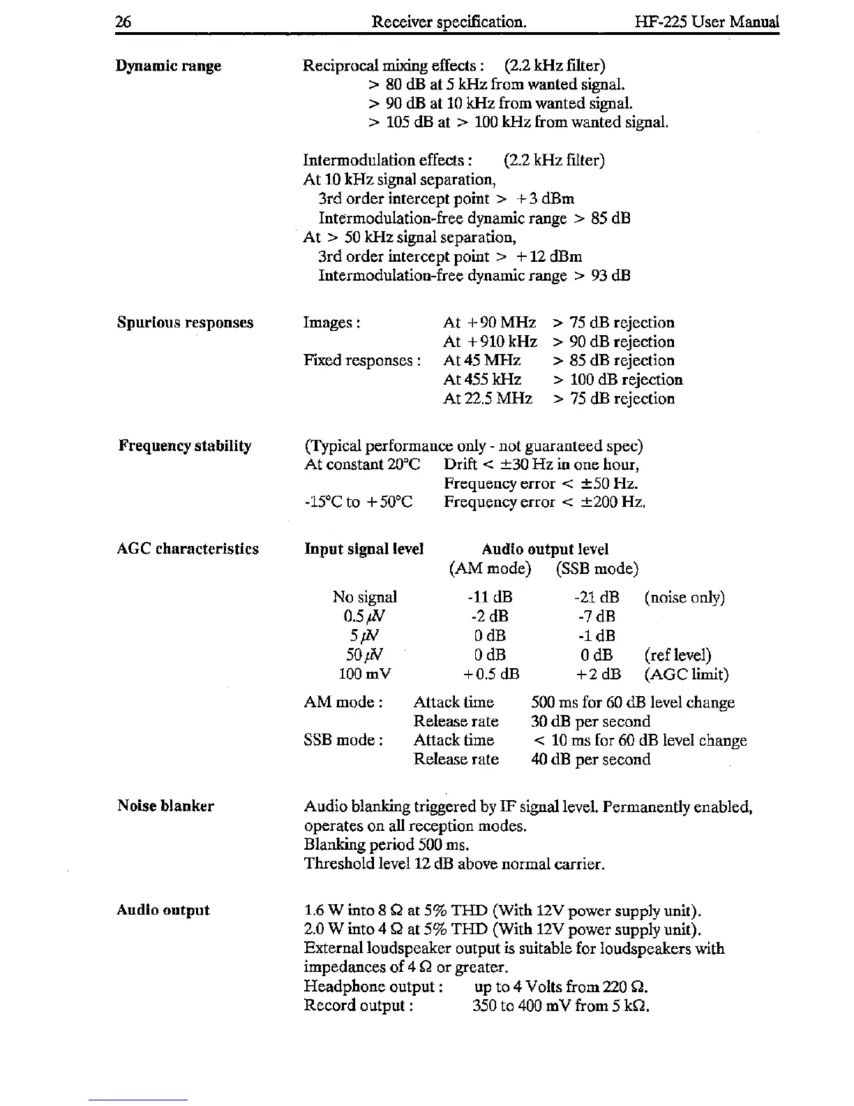 Lowe HF-225 - Selectivity; Dynamic range; Spurious responses; Frequency stability