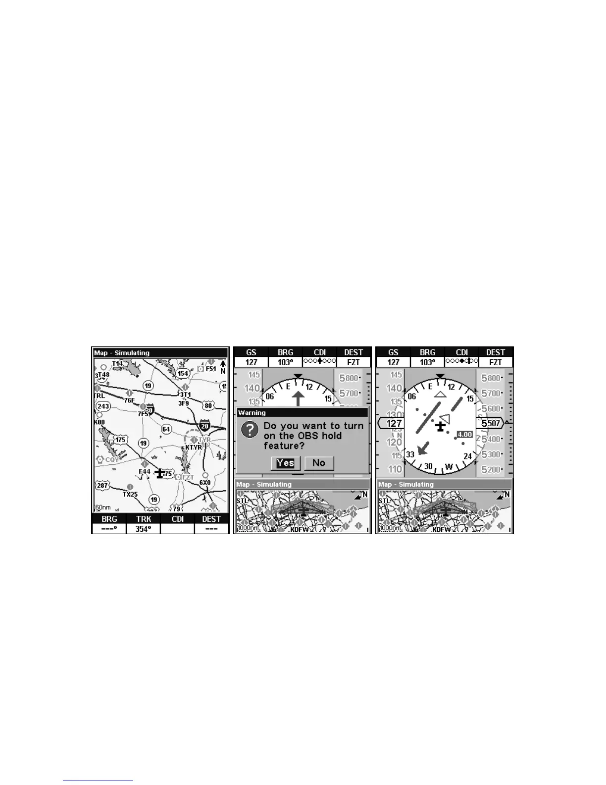 Hold menu. Right, HSI display with OBS Hold activated. The Course (if