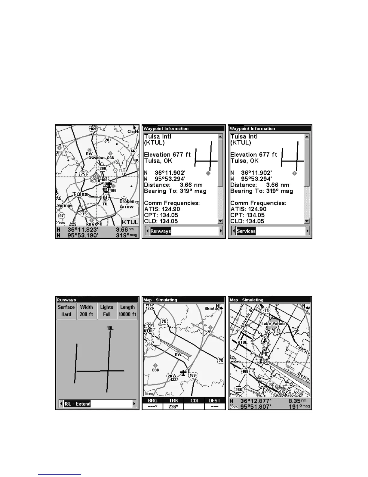 Runways screen at left, with Extend option select. Center, map shows