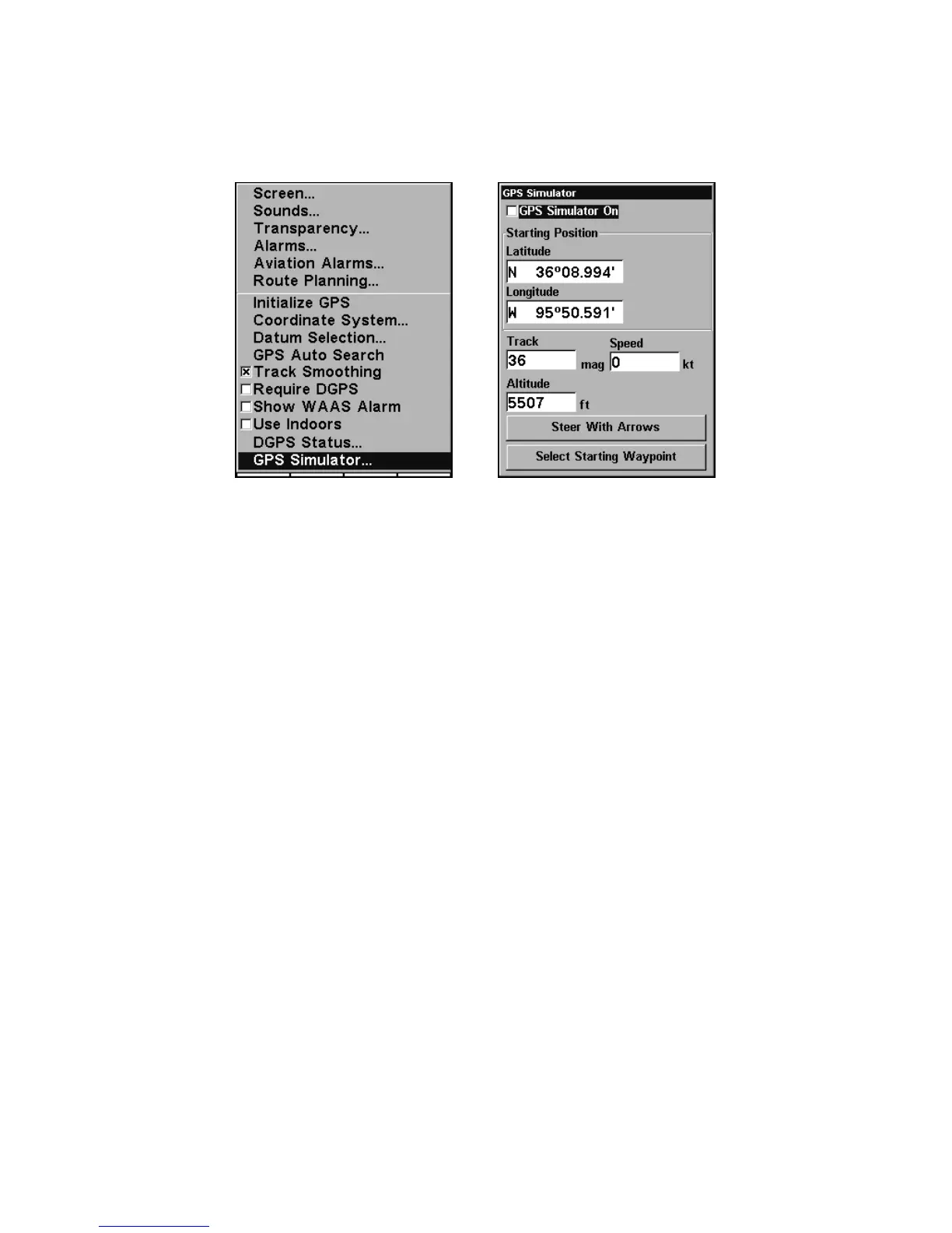 GPS Setup Menu, left, GPS Simulator Menu, right.