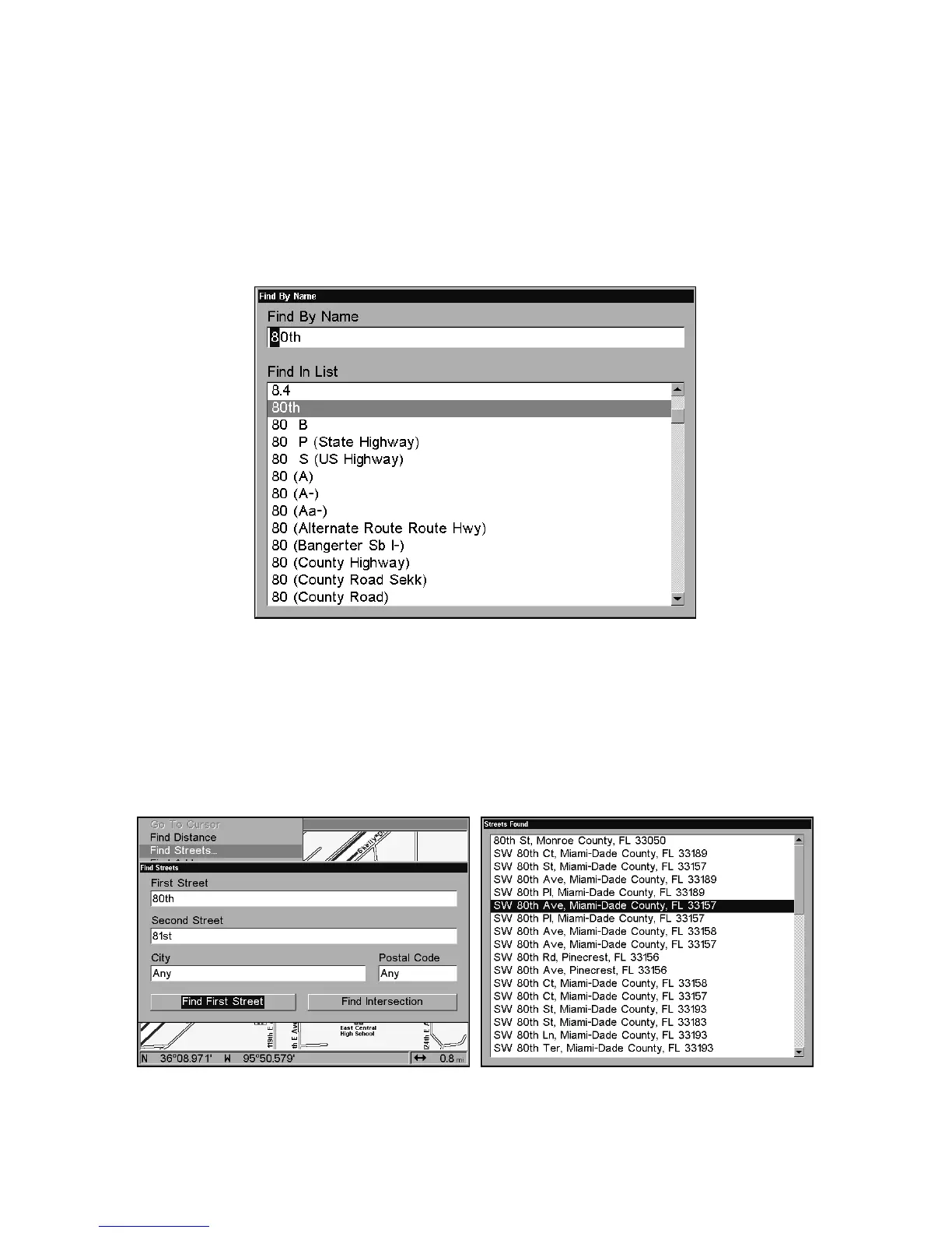 At left, the Find Streets menu with the Find First