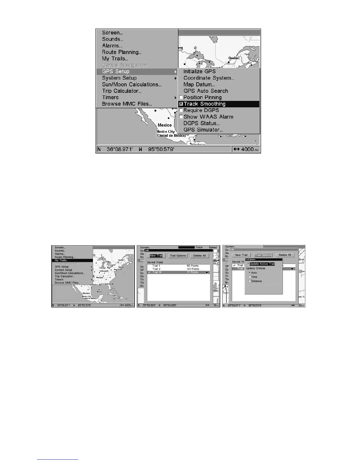 Main Menu, left, Trails Menu, center, Trail Options, right.