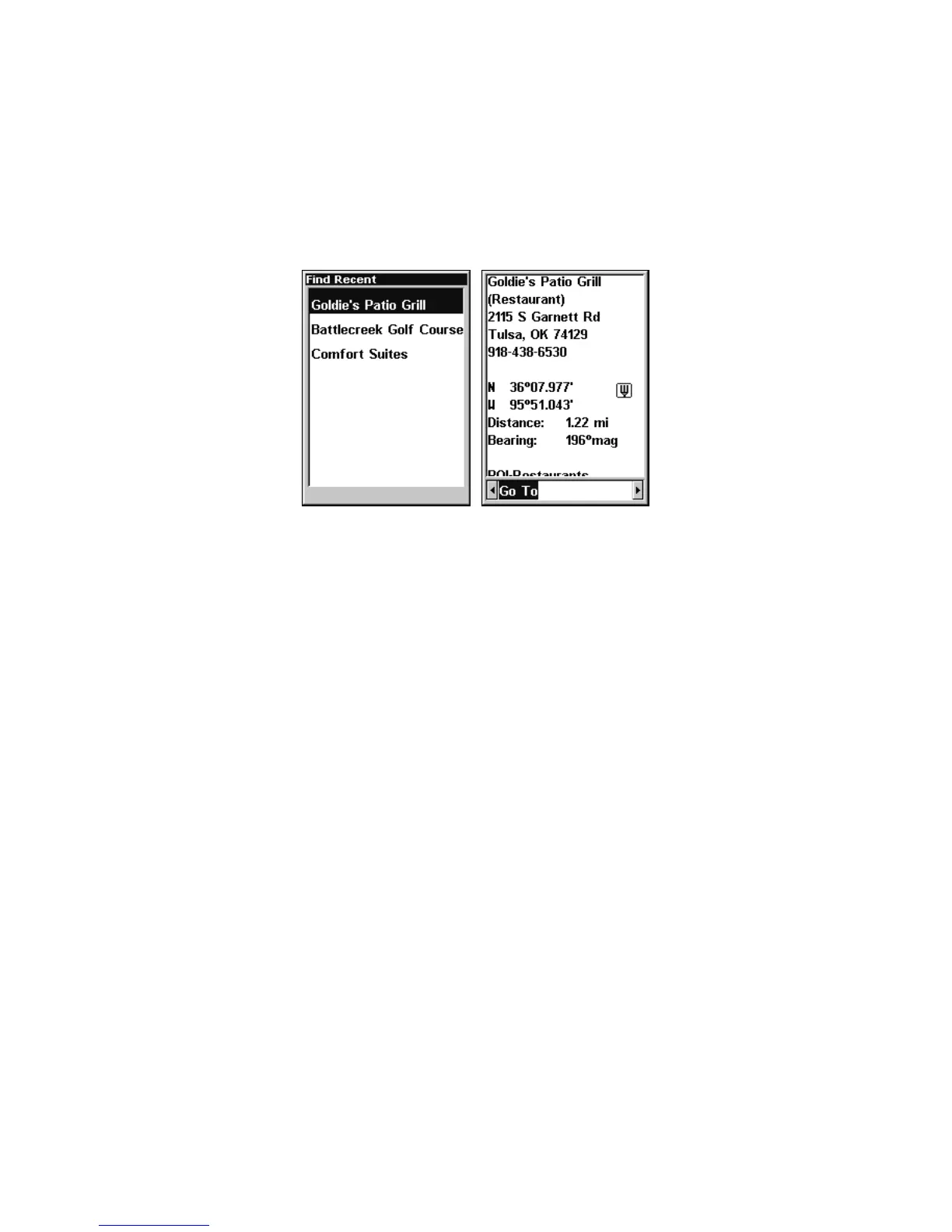 Recent Finds menu (left) with POI information window (right).