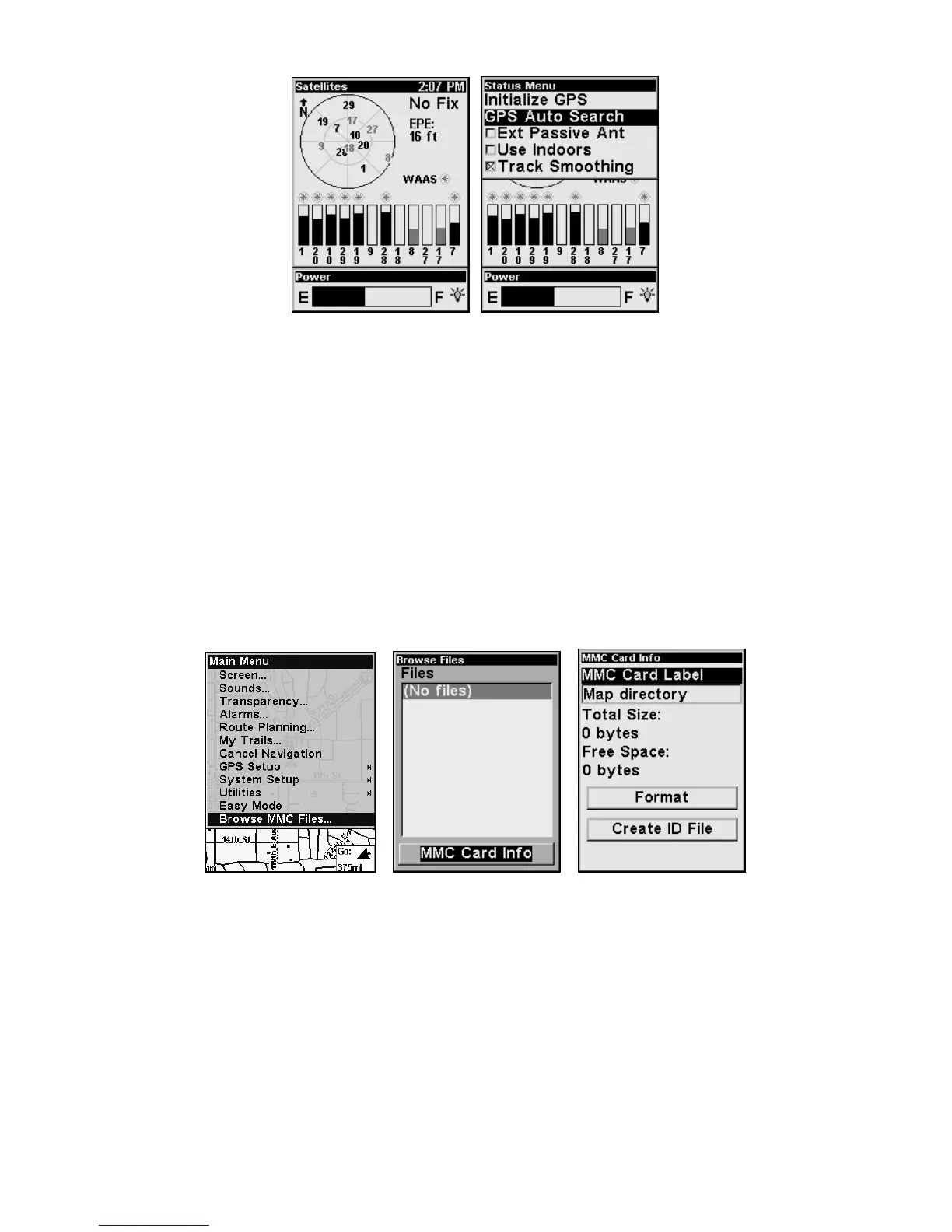 Main Menu (left); MMC File Browser (center and right).