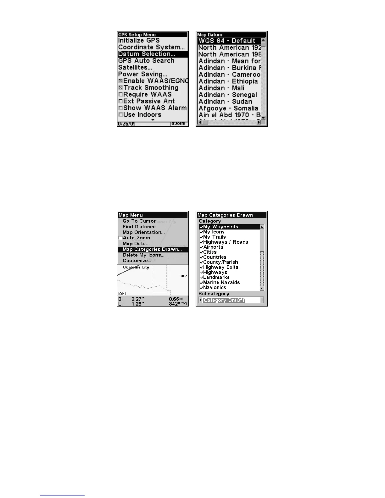 GPS Setup Menu (left) with Map Datum Menu (right).