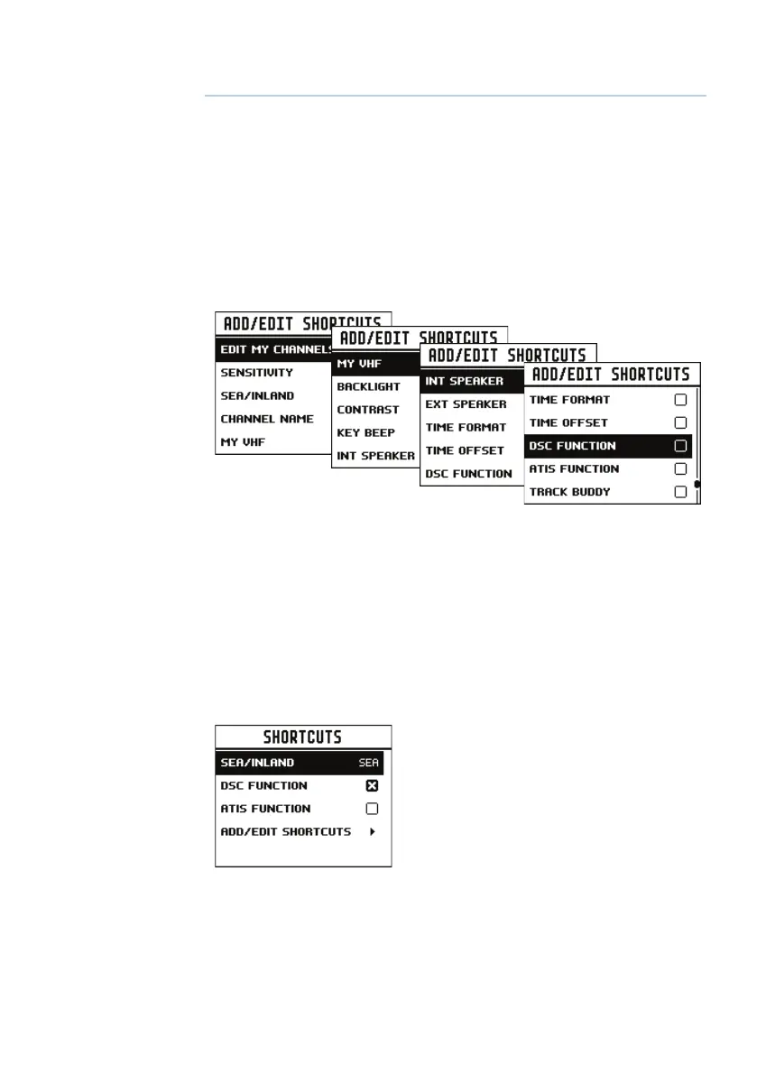 The Shortcuts page is accessed by a long press of the VOL/SQL