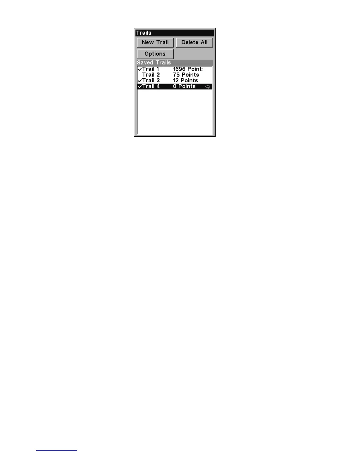 2. Press ↓|↓|↓ to enter the Saved Trail list, then use ↑ or ↓ to select