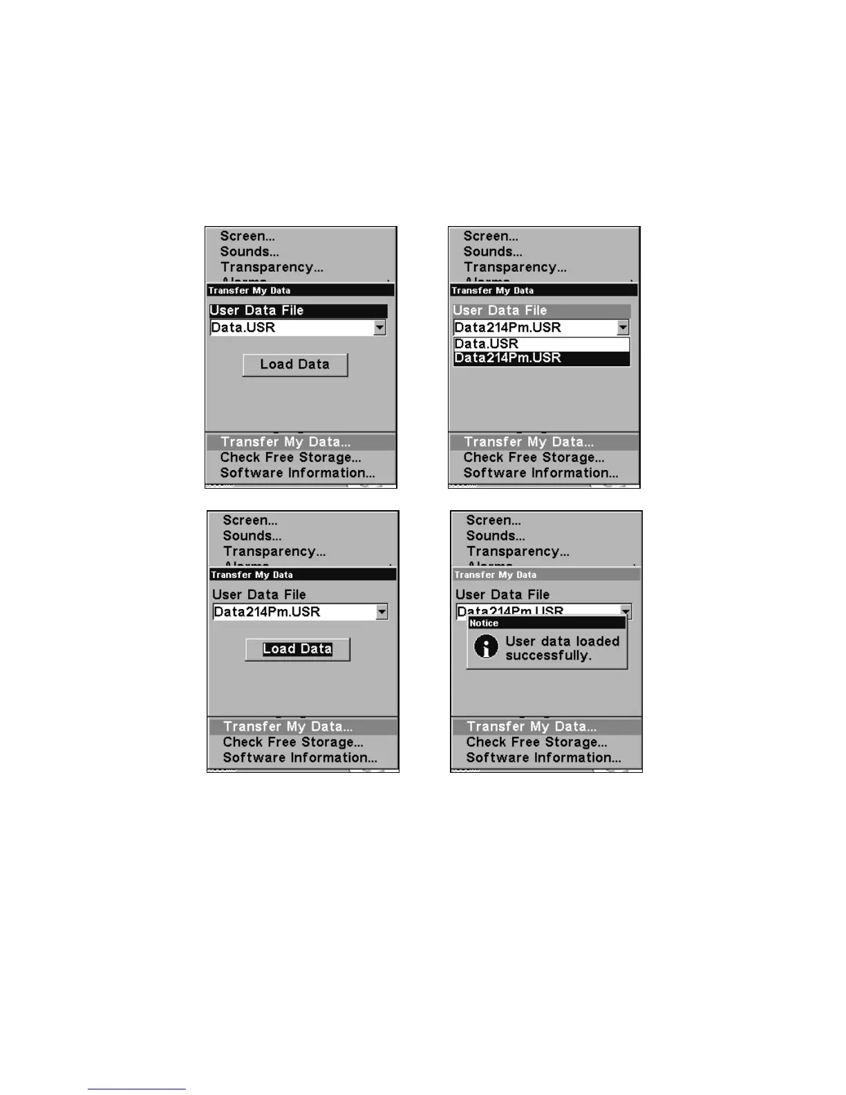 These figures show the menu sequence for loading a GPS Data File