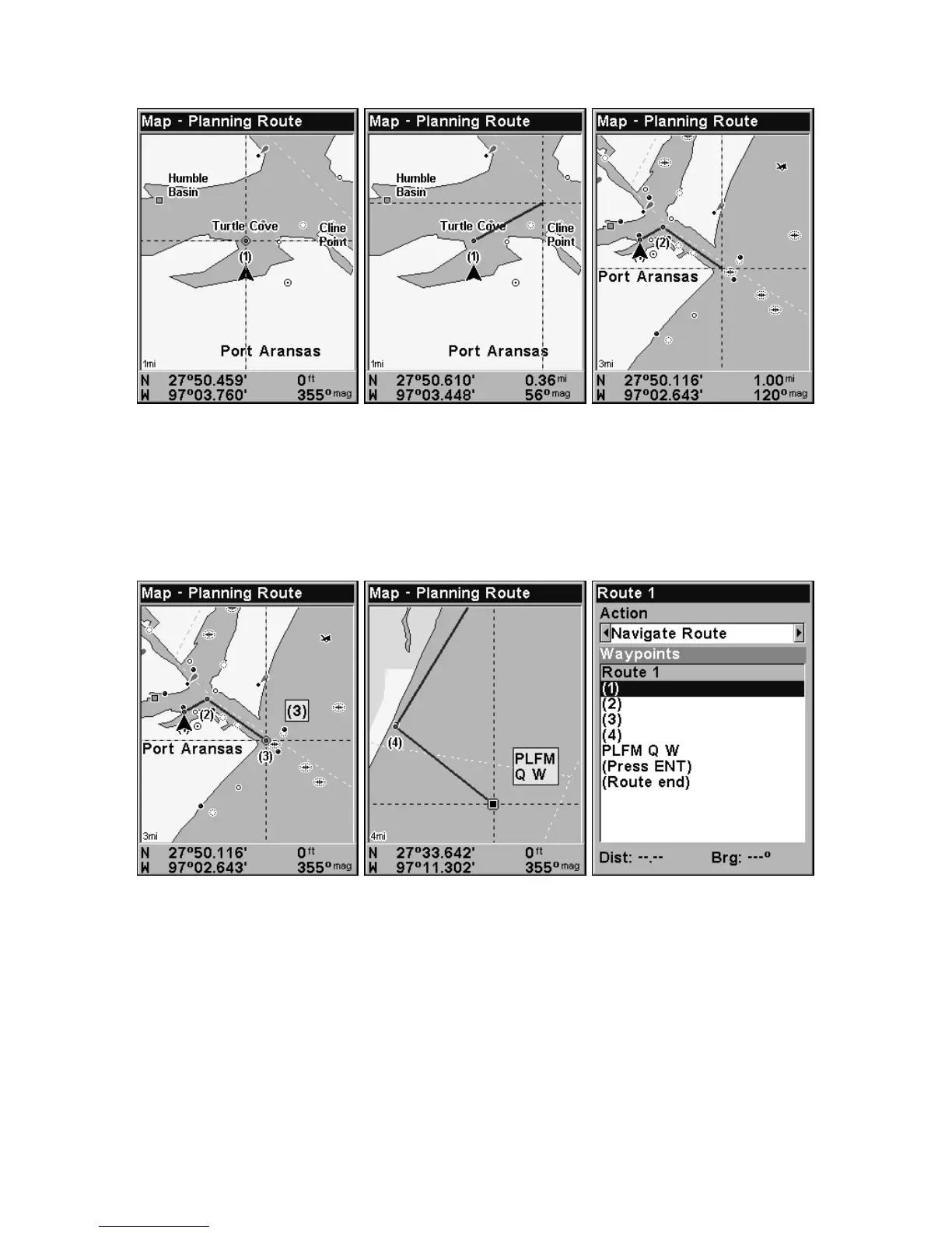 Route creation sequence, from left: Fig. 1. Set route waypoint (1) at the