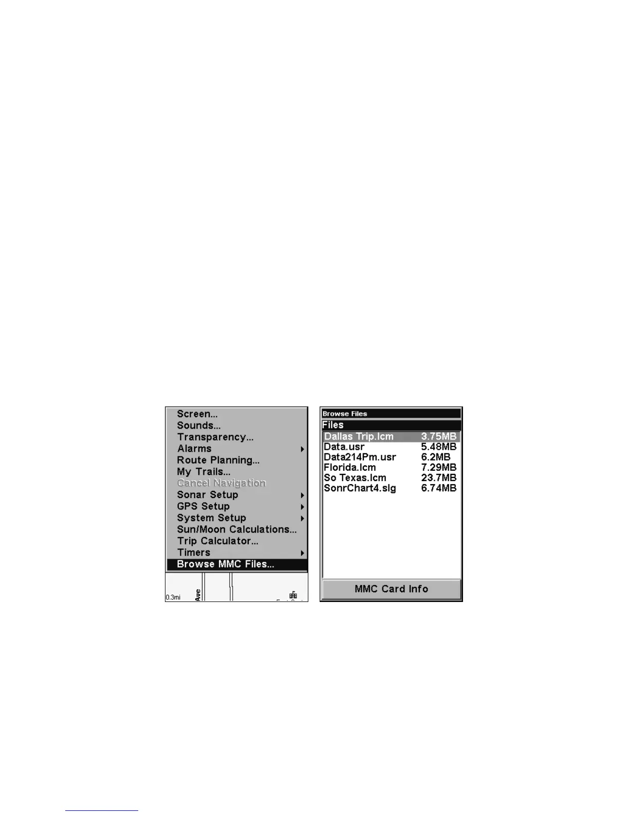 MENU|MENU|↓ to BROWSE MMC FILES|ENT. Press ↓ to MMC CARD