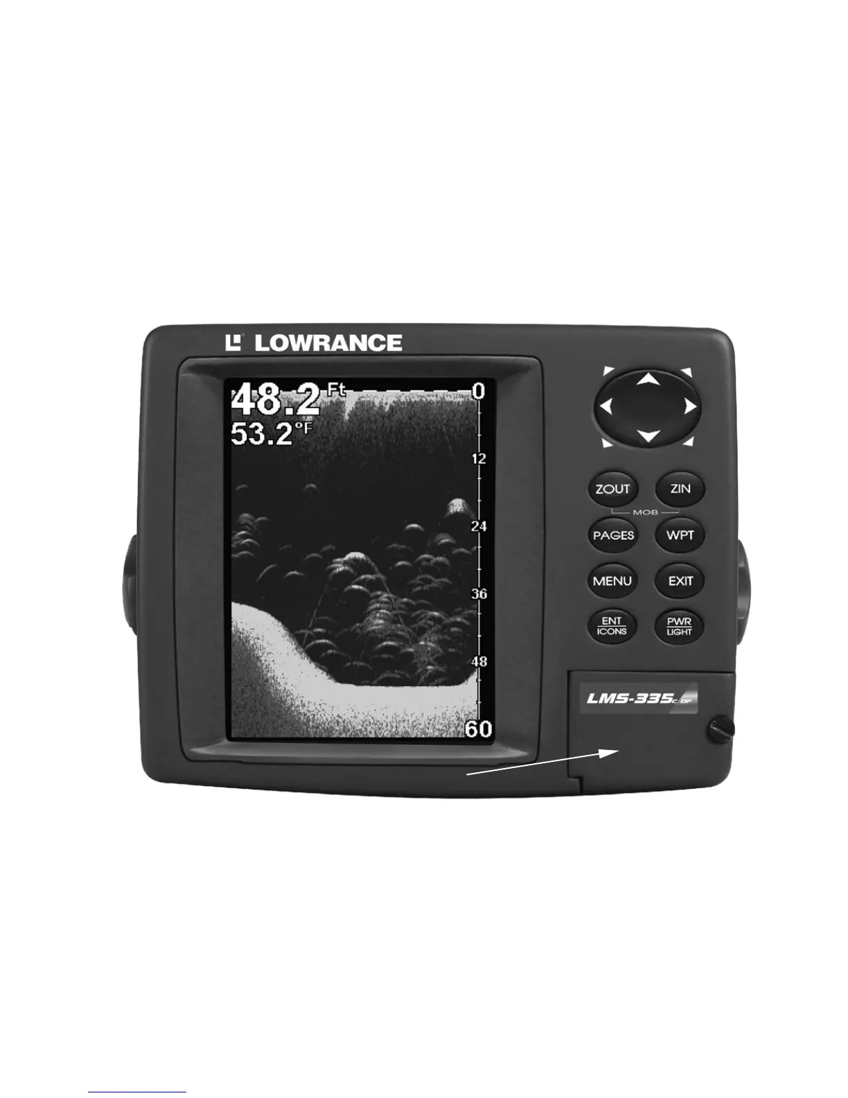 LMS-335C DF sonar/GPS unit, front view, showing full sonar chart