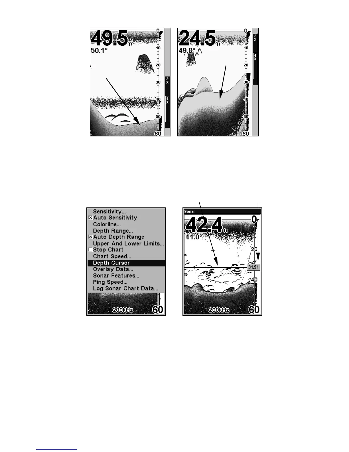 At left, Sonar Page menu with Depth Cursor command selected. At