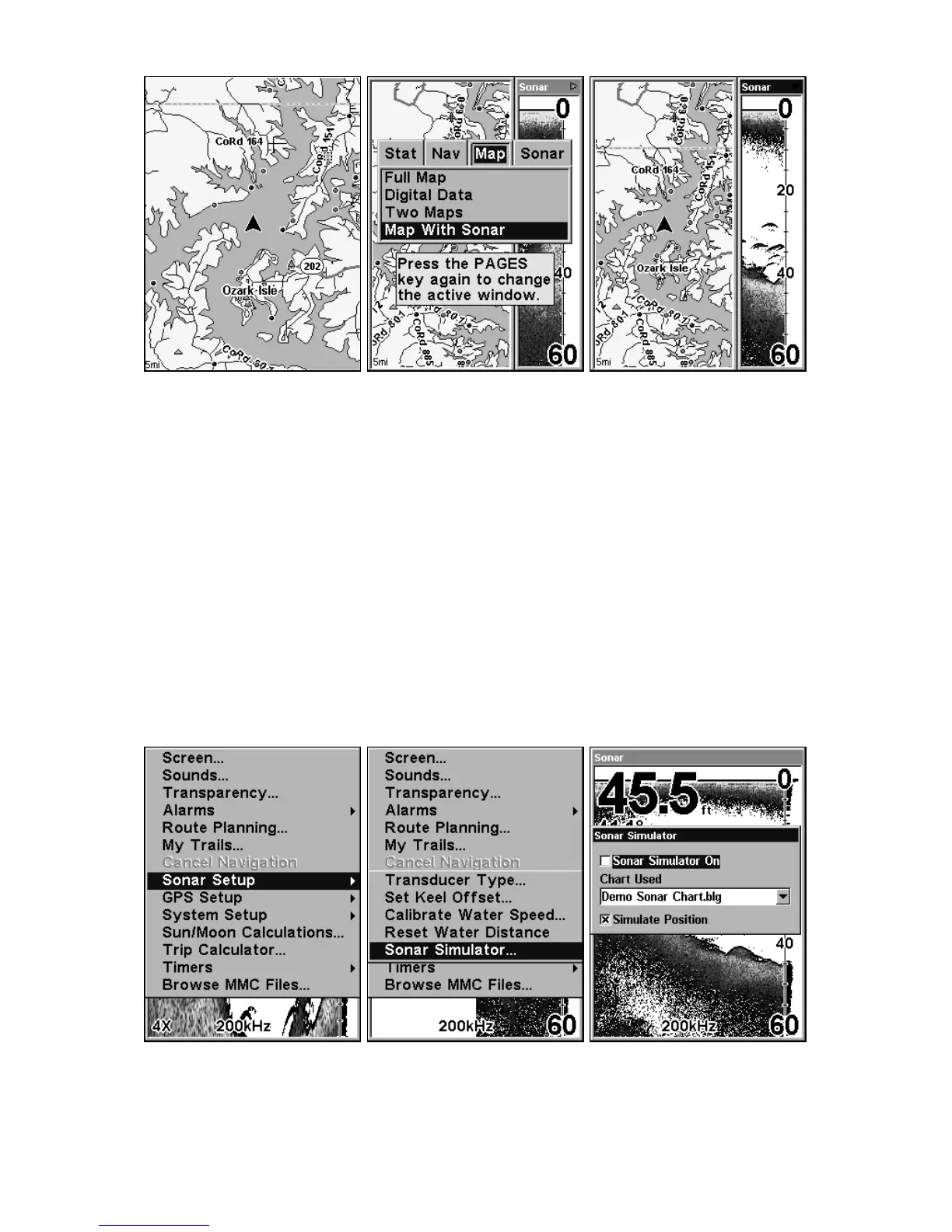 At left, Main Menu with Sonar Setup command selected. Center, sub-