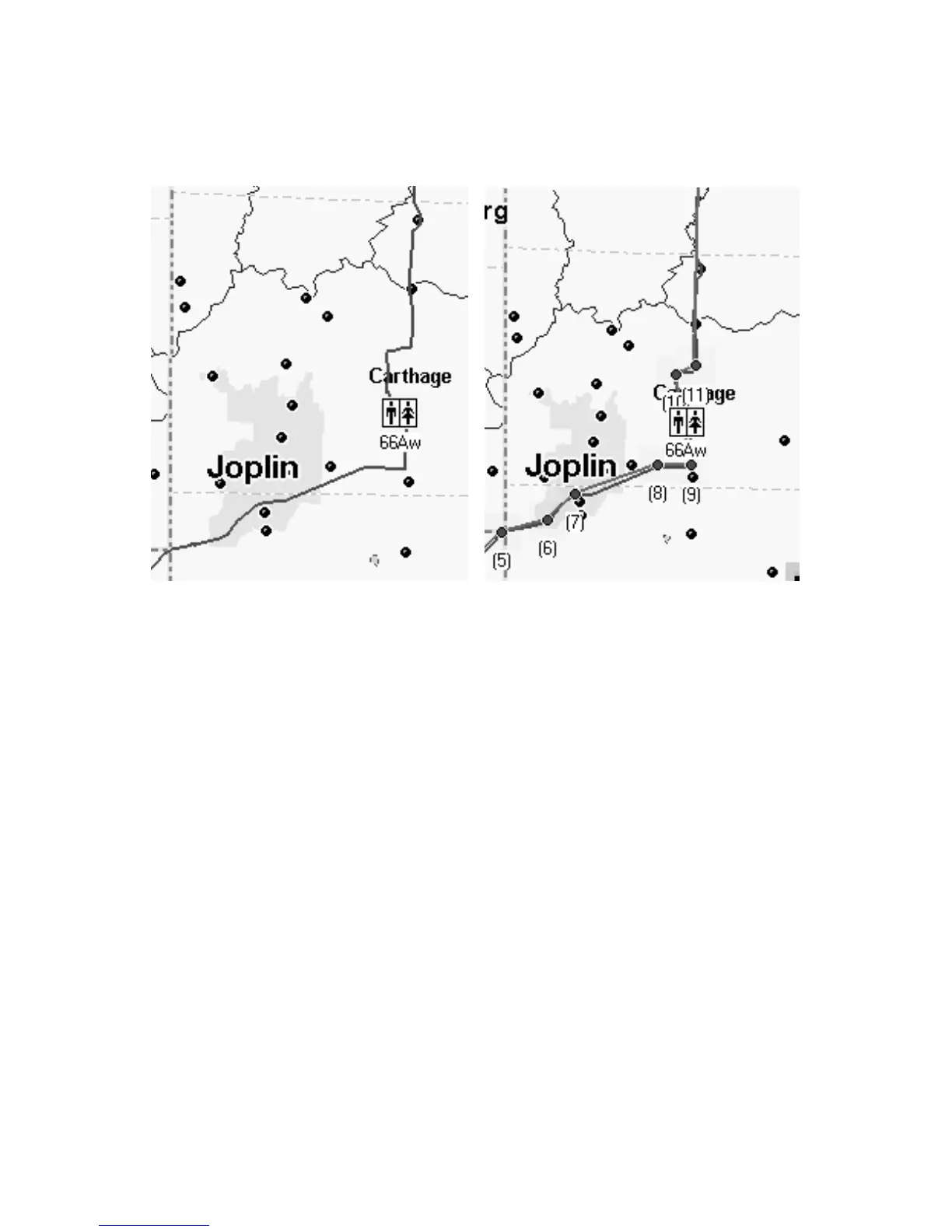 Trail segment through Joplin before conversion to a route (left) and