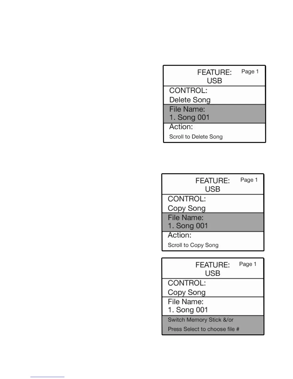 COPY SONG - Copy a song from one memory stick to another, or copy a song from one location on a mem-